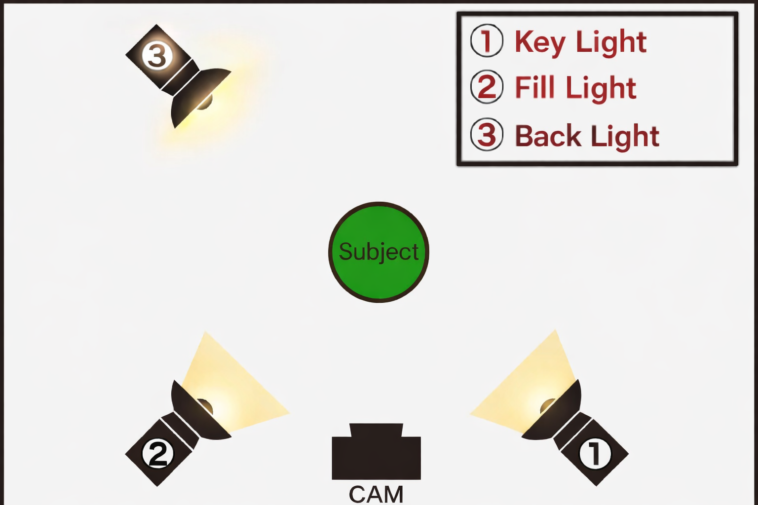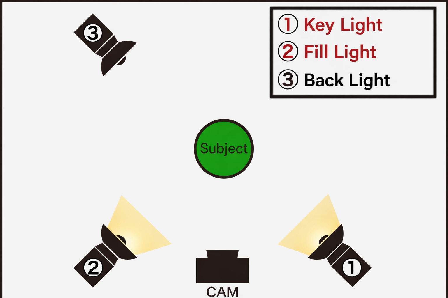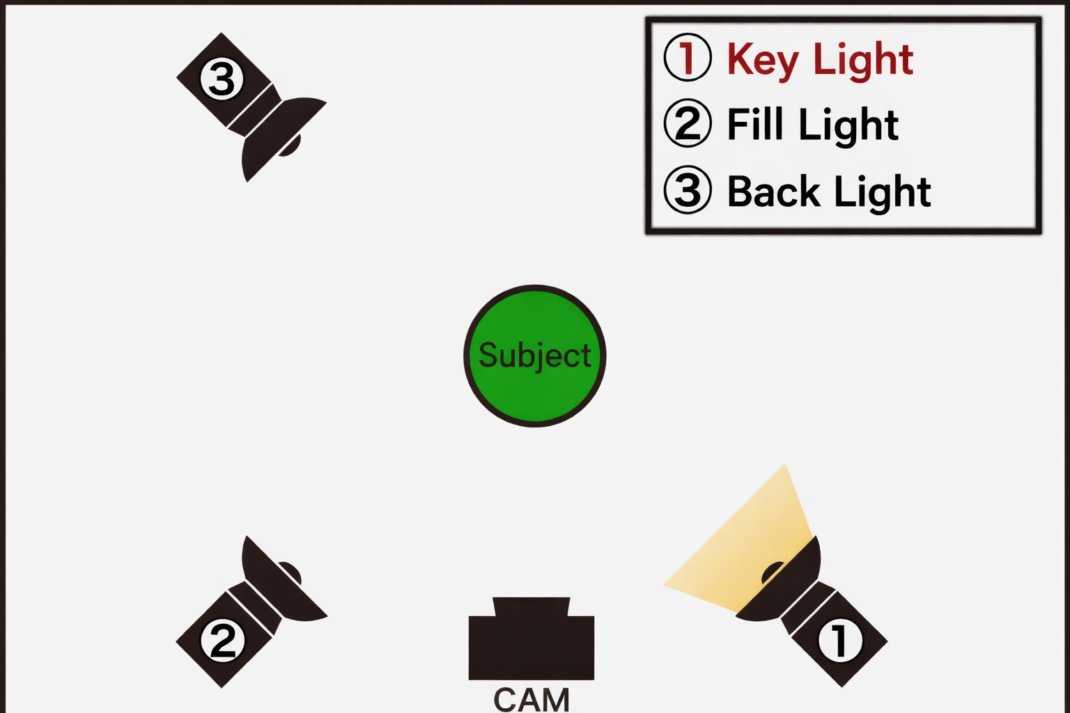・Fill Light: a light directed toward the subject from the opposite side of the Key Light to provide softer illumination and reduce shadows.