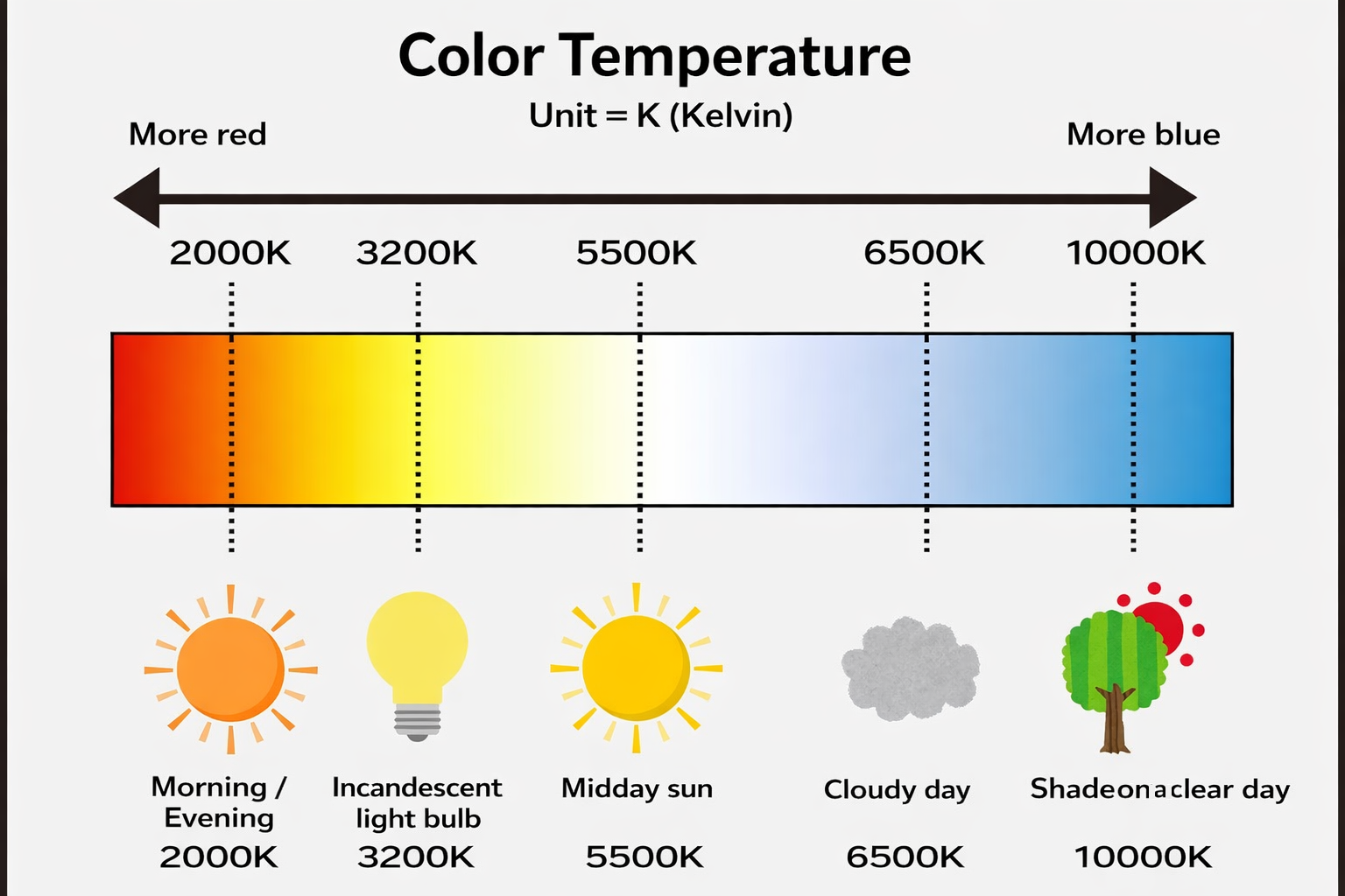 Color temperature is measured in "Kelvin(K)". Lower color temperatures indicate「warm colors」like red and orange, while higher color temperatures indicate "cool colors" like blue and white.